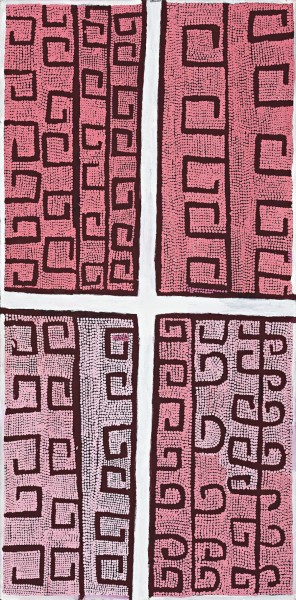 The subject matter of Boxer Milner's unique geometrical works are the clouds, rainbows and temporary creeks and tributaries of his country in the area around Purkitji (Sturt Creek) located at the top end of the Canning Stock Route in Western Australia.