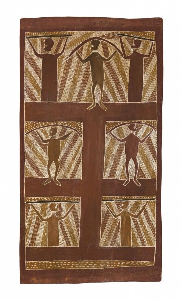 The mission label attached verso reads: ‘Top; Clouds and three Thunder Men – Two with knees on ground, one standing carrying spears; Centre; Brown stripes, hills – some men holding spears; Bottom; Some Men kneeling – this is portrayed in Aboriginal dances.'