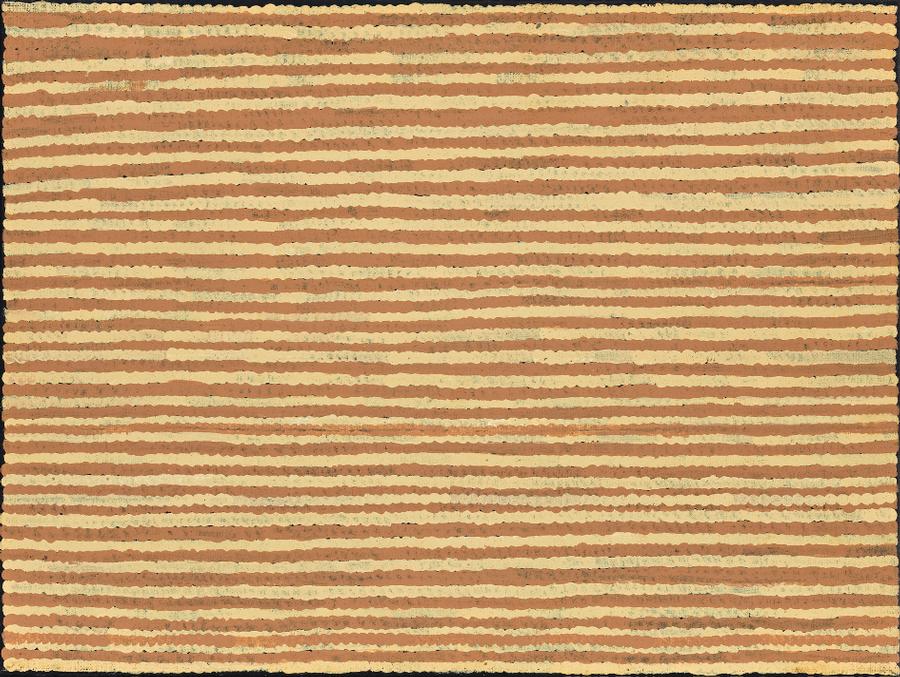 This painting is accompanied by a certificate of authenticity from Papunya Tula Artists which states: 'During Mythological times a group of men camped at the site of Ilyingaugau near the secret cave site of Mitukatjirri, south–east of the Kintore Community. The straight lines through this work represent spears which the men are straightening. This is done by slightly warming the spear over a fire and straightening while it is warm. These men were preparing their spears as they heard of a possible confrontation with a group of men from the Tjikari area further north.'