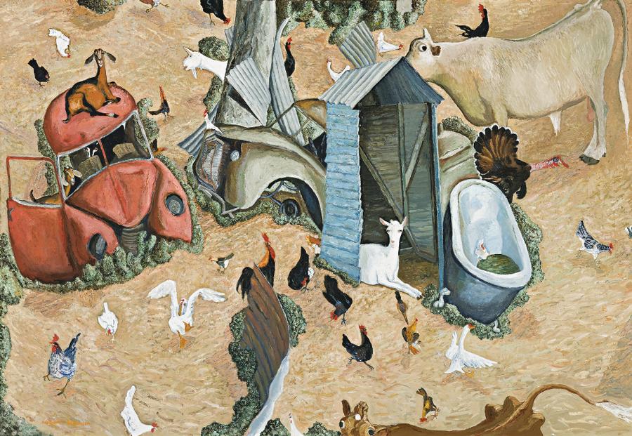 William Robinson, in his farmyard scenes, delights in the unusual based on the everyday, as seen to perfection in Construction with Wrecks, Dunny & Bull 1984. What could be more prosaic than the backyard scene with a few chooks and ducks, a discarded bathtub, and a wooden dunny? Add a few goats, turkey, bull and cow, together with the wrecks of car bodies and you have the ingredients of the painting. The miraculous transformation into an absorbing work of art is achieved by a blend of whit and whimsy, including the unusual high viewpoint adopted, curious perspectives, fascinating rhythms, and humorous detail. The cow's eyes balance on the bottom edge of the picture. The white bull and the black cock seemed intent on eying each other off, and on it goes. Robinson's painting has all the fascinating detail that you find in a work by the great Netherlandish artist Pieter Bruegel the Elder. You never tire of reading it, and you discover something new on each return visit. It is the same with Robinson. Bruegel-like, the white goat sitting at the entrance to the dunny suggests some wise bucolic proverb or aphorism, while two white ducks add a touch of balletic beauty to all this busyness. Robinson's playful anthropomorphism is the hallmark of his humour. Somehow the two car wrecks take on human personalities 'perhaps a redhead in earnest conversation with one of grey? Meanwhile, the prominence given to the piece of corrugated iron in the centre foreground conjures up all kinds of responses without an answer. Perhaps of walls that divide and are torn down 'black chooks united with white ducks' amid the detritus of life. The absence of a horizon and tightness of composition create an intimacy that heightens the notion of backyard gossip. Profiles and frontalism are used to chatty effect. Yet, colours are amazingly lyrical as one happily overlooks the brilliant compositional order given to such disorder. For all its seeming haphazardness, the ordering is highly sophisticated, if not paradoxically elegant. Forms advance and recede as the picture plane opens up a world of wonderland in a spatial depth of its own. In this and other engaging paintings inspired by his farm at Birkdale, Robinson presents the epic comedy of life through that which surrounds him. As Lynn Fern observed in her monograph, these farmyard paintings 'are full of the wry humour of the townsman attempting to adapt to the life of the land.'1 It is a disarming part of their attraction.