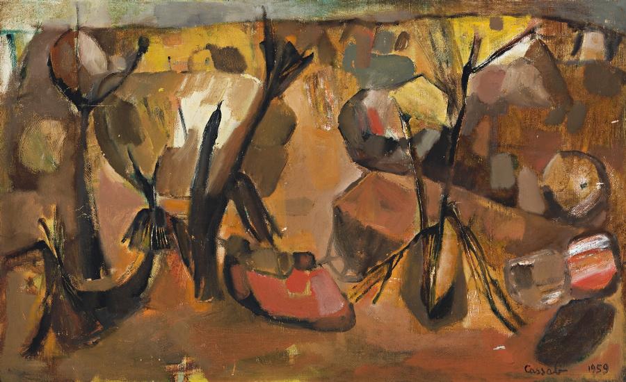 signed and dated lower right: Cassab 1959 signed and inscribed verso: DEAD TREES & STONES, Judy Cassab