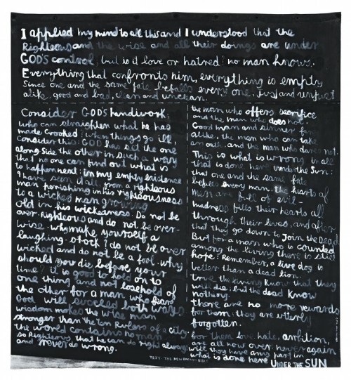 Continuing their analysis of this final quartet, Browne & Bloem suggest '...In the first two paintings, The emptiness of all endeavour and Is there anything of which one can say, Look this is new?, there is a sense of the 'emptiness of all endeavour', of the meaninglessness of an endless repetition of what has already been done, and of a despairing belatedness. Life is no more than endless cycle of repetition, a kind of living death. There is no real advantage to a righteous and wise life over that lived by a fool; as McCahon concludes, 'The men of old are not remembered, and those who follow will not be remembered by those who follow them'.