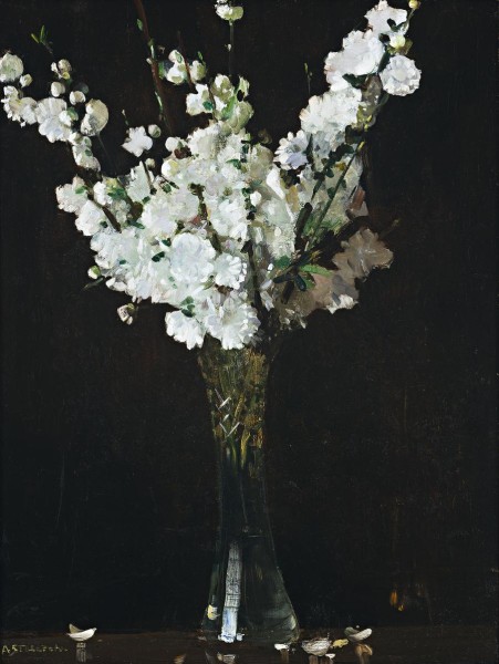 Australia's leading Impressionist artists, Tom Roberts, Frederick McCubbin and Arthur Streeton all painted flowers pieces. Although well known for their subjects of shearers, pioneers, and golden summers, their flowers paintings provide valuable insights into their art. As varied in approach as the varieties they painted, Roberts has a glorious Christmas Flowers and Christmas Belles c.1899 in the collection of the Manly Art Gallery as well as later paintings of poppies, roses and pelargoniums in private and public collections. McCubbin's delightful Still Life 1882 in the collection of the National Gallery of Victoria shows honesty, chrysanthemums and pansies painted in the Whisterlerian manner. Streeton's large body of flower paintings are jealously held in many collections, greatly admired for their realism. Apple Blossoms in a Vase c.1934 is a classic example. The pink-whiteness of the blooms and the sparkle of light on the cut glass vase are heightened by the velvety dark background in a manner most characteristic of Streeton. The translucent tall vase provides a perfect contrast to the fullness of the flowers, petals fallen on the shining tabletop adding an informality which increases the mood of intimacy. As a painter-gardener, Streeton knew his flowers well and celebrated their beauty and botanical variety with a painterly ease that is captivating. The facility with which he painted the natural appearance of Apple Blossoms in a Vase appears so effortless that the skill involved in its execution can be easily overlooked. In composition, for instance, the flared base of the vase bursts into the letter 'V' for victory - of the glorious, colourful flowers. For Streeton, flowers were a poetic metaphor of the triumph of beauty. Apple blossom, like all blossoms, is a harbinger of spring and the renewal of life. Reviewing a 1931 Streeton exhibition, The Argus art critic Harold Herbert wrote, 'His love of flowers inveigles him into a manner with paint which makes them tangible, beautiful things.'1