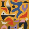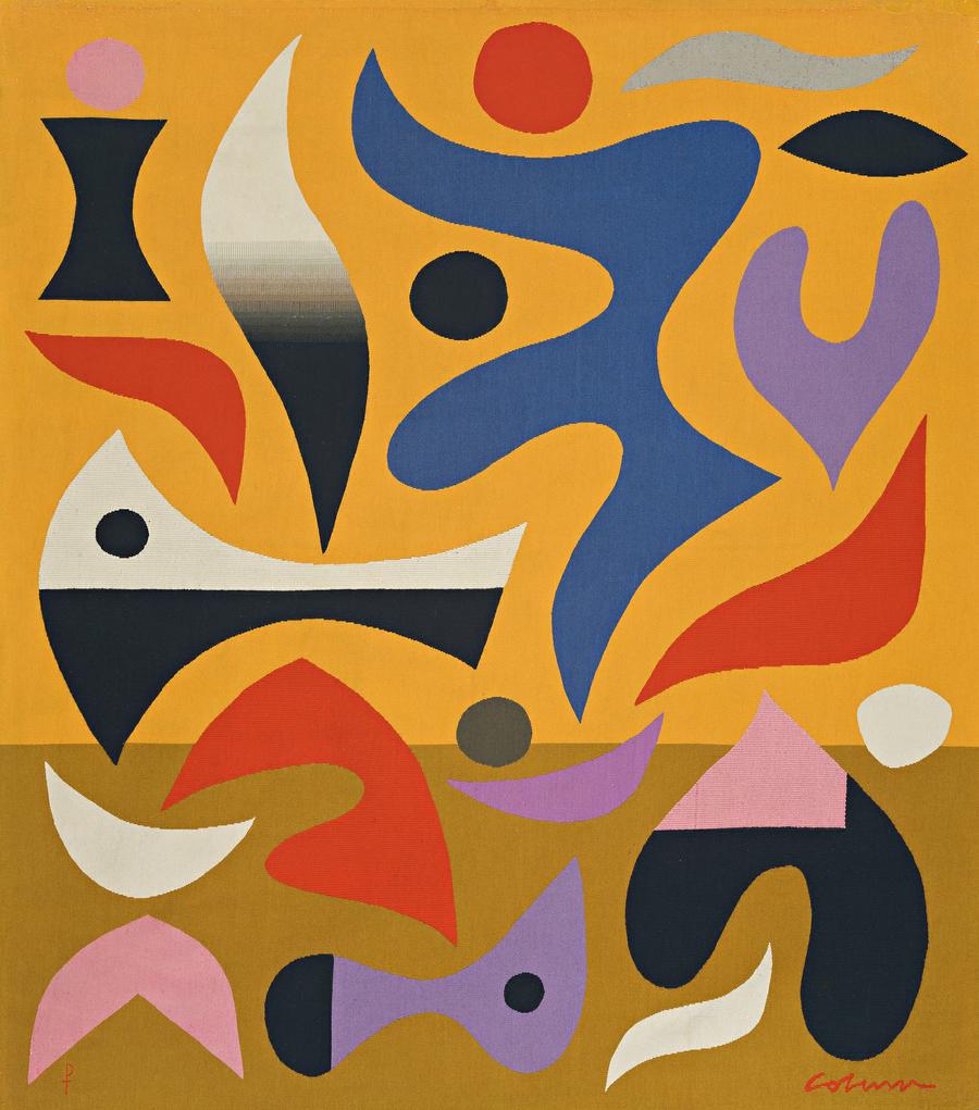 Coburn's art is ideally suited to tapestry design. Grand in concept, his designs translate readily into a scale suitable for wall hangings. Stylistically, the overall flatness adds to the highly decorative nature of his work, completely in harmony with the clarity of form and bright; colours that typify his best. Coburn himself said, 'My style is precise, clear and deliberate.'1 Although his forms are largely biomorphic and geometric in appearance, they take on a heraldic note engendered by a sonorous quality that flows from their marriage of vivacious forms and colours. Floating images echo and offset each other as they pulsate with life. Although Coburn occupies a highly respected position as one of Australia's leading abstract artists, his art is much inspired by nature and the rich varieties of the landscape. Speaking about another tapestry, Coburn said, 'Some of the shapes ... could appear to be like birds, but they are ambiguous, deliberately, because I like all my shapes to be ambiguous so that people can read other things into them what they like.'2 A mood of joyous celebration pervades all his work. This is readily found in Byzantium where colourful shapes clothed in seductive reds, pinks, mauves and blues sport across a simple field of colour, part yellow, part fawn. The introduction of the neutrals black, white and grey provide visual anchors within this feast of splendour, all recalling the exotic richness of fabled Byzantium where East meets West in unrivalled splendour.