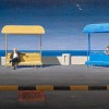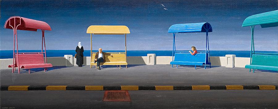Jeffrey Smart is an inveterate traveler, stating in an interview with Desmond O'Grady that, 'living in Italy's very convenient for getting around the Mediterranean, as the ancient Romans found.'1 This is reflected in his art, not only in the many paintings of the autostrada, vehicles, and bus and railway stations, but also in the places he visited. During 1984 he went to Bayreuth for the Wagner Festival, followed by Prague, a visit to Australia for an exhibition in Sydney, and then to Cairo and Luxor over Christmas into early January. His paintings of the same time included The Terrace, Madrid Airport II 1984-85, Rome Metro Exit 1984-85 and Off Brindisi 1985. The Esplanade, Alexandria 1984-85 was, no doubt, an outcome of his visit to Egypt. Alexandria, today the second largest city in Egypt, lies directly on the Mediterranean coast. Founded by Alexander the Great circa 331 BC, the Lighthouse of Alexandria was one of the Seven Wonders of the Ancient World, its famed library being the largest. While this would have appealed greatly to Smart, his painting is totally devoid of such fabled references. If anything, it is more like a still life by Giorgio Morandi whom he greatly admired. Figures are set in isolation and nothing moves in an atmosphere of fixed intensity. The barricade in shadow across the foreground acts as a metaphor, keeping the viewer at a distance, the grill a reference to going down the drain. Barry Pearce in his monograph on Smart refers to him shielding 'his emotional life behind a carapace of methodology.'2 Assiduously avoiding personal reference and emotion in his work, Smart involves himself with achieving compositional perfection through the right balance of forms and colours. The images of people in The Esplanade, Alexandria are not so much to do with human beings, as objects to provide the right scale. In another interview some years ago with O'Grady in Rome, Smart said, 'I am getting better at doing my things. Development lies in painting the same themes better rather than seeking new subjects. Giorgio Morandi, one of the greatest modern artists, always painted bottles.'3 In The Esplanade, Alexandria Smart pursues familiar themes with diligent objectivity. All is carefully considered and in perfect balance. The shadows are as precisely delineated as the shelters of which they are part. In the clever use of primary colours, yellow attracts the eye, but the seated figure facing the viewer invites no further investigation. This is repeated in the back view of the women to his right, the profiled figure to his left again a compositional highlight through profiled form and colour. In this classic essay by Smart at his enigmatic best, sensuous colours seduce, suggestions tantalize, but passions are held firmly at bay.