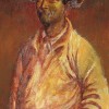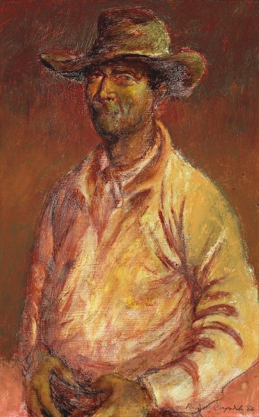 Drysdale's images of the Australian outback and its peoples have become part of the way in which we see and understand our country. As Sidney Nolan said, 'Drysdale is the most Australian of us all.'1 Red skies of surreal vastness and Venetian splendour, infinite horizons, the resilience of peoples and their integration with the landscape are the distinguishing characteristics of his art. The 1965 Leicester Galleries exhibition presented such classic examples as Red Landscape 1965 and The Ruins, Lake Callabonna 1965. Significantly, half the paintings were portraits of Outback characters and other individuals, of the singular Brandy John 1965, or figures stoic in stance and character as in Tom Finch 1964 and our painting, The Head Stockman. These are set against richly coloured, painterly backgrounds in which no details detract from the image. They are marked by time, isolated but unbowed images of the Australian character - laconic of mien, of rugged individualism and egalitarianism. The immediacy of Drysdale's characters comes from the artist's own sense of mateship and the genesis of his paintings in lively sketches made on the spot. Much of the magic of his art comes from that warm personality which was Drysdale. Alan Ross, editor of the London Magazine described him as 'an artist with a tough, masculine temperament and seductive painterly skills...'2 The combination is still unrivalled in Australian art, giving us a unique collection of portraits of characters of the Outback, indigenous and of more recent arrival. Direct of gaze and nonchalant of pose with thumbs tucked idly into his belt, The Head Stockman, presents a quintessential image of one of them.
