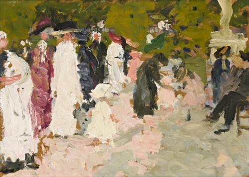 After Ethel Carrick's marriage to Emanuel Phillips Fox in London in 1905 they moved to Paris, living at 65 Boulevard Arago near the Luxembourg Gardens. The proximity of the gardens provided an ideal subject for their art as seen in Phillips Fox's (Figures in a Park, France) c.1907-09, in the collection of the S.H. Ervin Gallery, Sydney, and Carrick's Luxembourg Gardens c.1909. Carrick painted a number of Luxembourg Gardens paintings during this time, the earliest known being one dated 1906 and included in her Melbourne exhibition of two years later. The period was also marked by a close friendship between the Foxes and fellow Australian artist Rupert Bunny and his French wife Jeanne. For a while Phillips Fox's paintings showed an affinity with Bunny's, and Bunny painted his own series on the Gardens - The Stragglers c.1907 in the collection of the National Gallery of Victoria, Melbourne, and a number painted in the spring of 1909. Of the latter, In the Luxembourg Gardens c.1909 (private collection, Perth), shares with Ethel an interest in painting women and children relaxing or playing in the gardens, a marble statue nearby. It would be a pleasing coincidence to think that they painted together. The larger and more composed Bunny work was destined for the walls of the Paris New Salon, Carrick's delighting in the freedom and verve of an immediate impression. Significantly, Bunny gave his painting to the English artist Henry Edward Giles, who was working in Phillips Fox's Paris studio at this time. The spontaneity of Carrick's technique and engaging pictorial vivacity suggests that Luxembourg Gardens was most likely painted in the open air directly from the motif. The liveliness of the impression captures the passing moment to perfection, the shimmering paint giving a rustling feeling of engaging conversation and movement to the promenade of fashionably dressed mothers, nannies, and the children in their care. All is enveloped in a sparkling atmosphere of dappled sunlight. While Bunny's Luxembourg Gardens paintings embraced such subjects as Dejeuner sous les arbres, playing bridge and croquet, Carrick's brush included the pleasure of listening to music as seen in Concert in the Luxembourg 1909, a panel painting of similar size in the collection of the Castlemaine art Gallery and Historical Museum.
