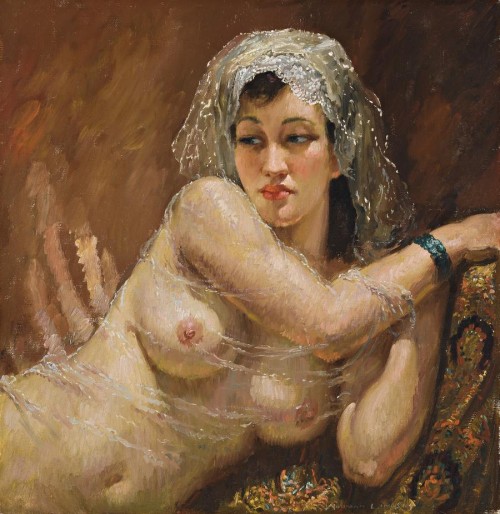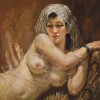 The buxom female nude cast in the role of Greek goddess, Bacchante, captive of Buccaneers, or odalisque appealed greatly to Norman Lindsay. A richly endowed symbol of sexual freedom in the face of the slavish Puritanism of his times, his nudes play a major role in his art. Presented singly, as in this painting, or featured as the central motif in countless subject pictures of bounteous pleasure ranging from the unrestrained adventures of Classical mythology through the more colourful moments of history such as the costumed delights of the Merry England in the days of Charles II when pleasure was a national pastime. The fair-haired Rose, Lindsay's second wife, was his favourite model, later followed closely by Rita Lee, who was the model for Odalesque. Rita was the perfect choice, her own exotic charms ideally suiting the role of the Eastern concubine or chosen beauty from the seraglio of the Sultan of Turkey. The appeal of the mysterious East and the passions of the West combined in the dark haired Rita, her father being Chinese and her mother Spanish. They gave her a body that was fluid and languorous, olive skinned, almond eyed with long, dark hair caressing her shoulders. Her serenity added a majestic aura to each painting or etching in which she appeared. Lindsay thought her to be the perfect model for oil painting, '...who secreted within her all those emotional intensities from which any variation on the feminine image may be extracted. She had the loveliest breasts I ever painted from, and they drove me to despair. No crude colour extracted from the earth can hope to capture the pearly shimmer of light on the youthful feminine breast'.1 For six years from the age of eighteen Rita sat for Lindsay in his Sydney studio and in the Blue Mountains at Springwood. In Odalesque and other like celebrations of feminine beauty, Lindsay tantalised the viewer through the fall of light on the wondrous bosom, seen through the flimsiest of veils. The relaxed pose of the voluptuous body and sultry look invites enjoyment within intimate surrounds.