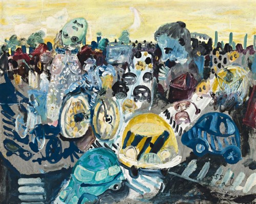 In Pedestrian Crossing 1954/55, the first impression is one of chaos as everything conspires to converge at the very moment safe passage is sought across the road marked crossing. John Perceval's agitated expressionist brush strokes and choice of colours are ideally suited to the subject - figuratively and emotionally. To add further to the confusion, Perceval dispensed with any rational depiction of space in a topsy turvey world of cars, bicycles, roadways, road stripes and people. Its child-like irrationality and emotional impact is suggestive of the surreal world of dreams in which nothing is quite right. During the early fifties Perceval adopted a deliberate naivety of style as in Adam and Eve with Garlic Plant 1952. Those paintings of his children such as Matthew, Tessa and Winkie in a Field of Flowers 1954/55, show them 'with large eyes and long fair hair in a remote dream-like aura with Perceval's Volkswagen a Rabelaisian hump in the background.'1 The presence of the Volkswagen car is significant, newly acquired by the artist and an important means to move around Melbourne to such painting sites as Williamstown and to the nearby bush. The car was clearly a novelty that spilled over into his painting, the Pedestrian Crossing expressing something of the not so enjoyable aspects of city driving. At the time it was painted, Perceval and his family were living in the Melbourne suburb of Canterbury. The madness of this traffic scene full of Volkswagen cars fondly known as 'beetles' is most likely a nightmare kind of recollection of a visit to the city from the suburbs. The blue figure in profile in the upper right appears to be Perceval himself, trapped in a concrete jungle of buildings and roads where cars have taken over. It is interesting to reflect that some years later, in 1974, Peter Weir produced his first feature film, The Cars that Ate Paris, Paris being a fictional small Australian country town.