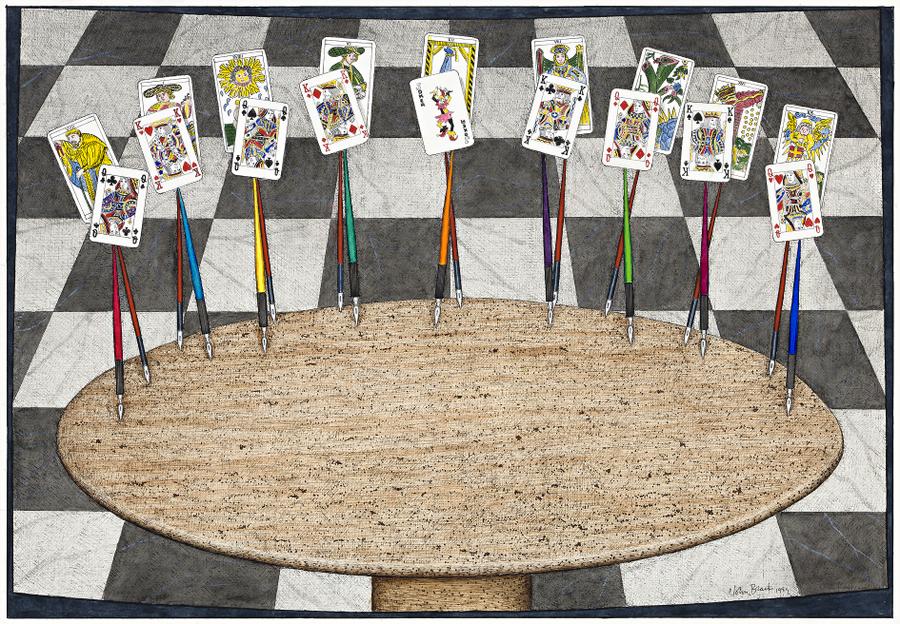 The black Queen of clubs is held by a rich red pen, and the Hermit card is behind her. The red King of Hearts has a rich cerulean blue pen, and his companion is The Magician. The red King of Diamonds has Justice, the Queen of Diamonds, The Tower, and so on. Part of the multi-dimensionality of John's pictures is the inclusion of meaning, via our inherited visual language - in theatre it is the language of mime that corresponds. Our thinking mind is part of the content of John's pictures, as well as our clever hands.