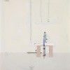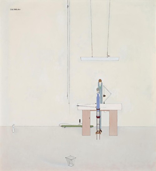The singularity of Edwin Tanner's art, as seen in Professional Engineers, is marked by a ready wit expressed through a comedy of equally sharp lines, all offset by cool colours. Not only is it a highly striking work visually, it also has a strong intellectual element, drawing on the experiences of his professional career as a design engineer of outstanding achievement. Precision of layout alludes to the plan or blueprint. The refined structures reflect his interest in industrial design - of aircraft, bridge building, and structural design, undertaken at Fishermen's Bend, Newcastle, Whyalla and the Hydro Electricity Commission in Hobart. His Hobart experiences gave birth to the humorous companion painting Waterpower Persons 1954, one of many works on the playful theme of people's inter-relationships with machines and dependence on them. Both show his superb draughtsmanship, the handmaid of engineers. Professional Engineers likewise expresses the artist's personality and vast range of intellectual and creative interests. First there is isolation, not just the emptiness of office order, but also the loneliness that comes from shyness of character, allied to a strong independence and individuality. The eloquence of his characteristic blank space is unrivalled. In The Public Servant 1953, in the collection of the National Gallery of Victoria, isolation is dressed in social commentary and mordant wit. The faceless office is empty as the clock's hand points to 5. And again, in the 1960 drawing Dead Cert, the line is as cutting as the image of the dead horse.