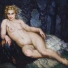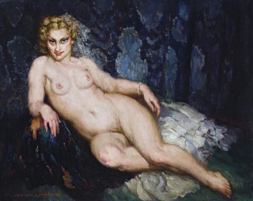 Reclining Nude is highly characteristic of the fleshy portraits of naked women that Norman Lindsay loved to paint. Set against a sumptuous backdrop of deep brocade fabric, the central figure reclines suggestively atop a frothy silken dress of which she has probably just disrobed. She looks directly to the viewer with a beguiling and bewitching gaze full of promise and encouragement. The whisp of a white lace mantilla cascades over her left shoulder lending a sense of innocence now taken. Quite possibly it is the same veil in which Rita poses in Odalesque 1942 (see lot 38). The model bears resemblance to the central heroine in Homage to Venus, bequethed to the University of Melbourne by the artist in 1969. Venus wears a similar pearl bracelet to the muse in this painting and poses in the same reclining fashion of a woman among her subjects.