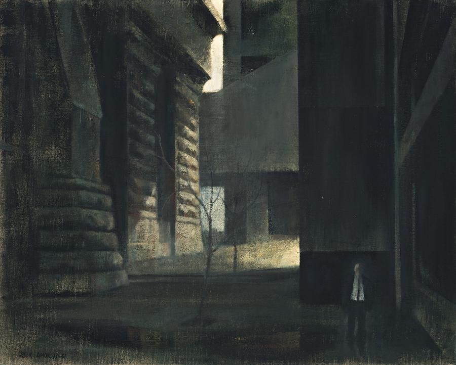 The defining element in Rick Amor's landscapes, and more particularly his cityscapes, is the sense of that which is untold and unrevealed. He is the master of transforming the everyday subject and evincing the ambiguities inherent in life and in doing so he taps a rich seam of humanity's complex existence. Study for the Secret City also contains other classic Amor leitmotifs such as the notion of the isolated individual somehow at odds with his environment and the sense of foreboding and portent in the dark spaces of the artist's landscape.