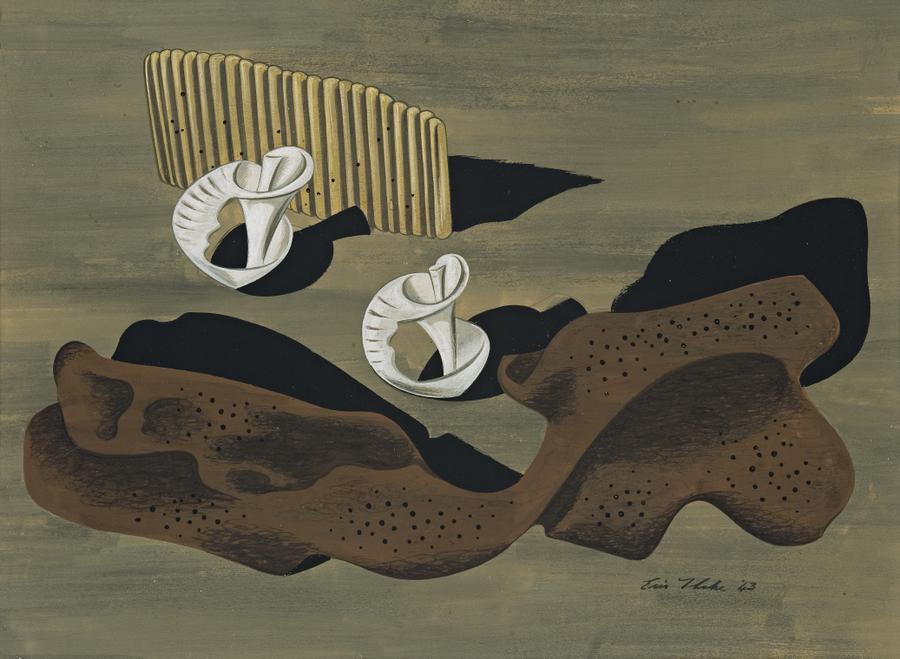 signed, dated and inscribed verso: BASS AND FLINDERS/ Eric Thake 1943/ Painted from objects/ found on Flinders Beach