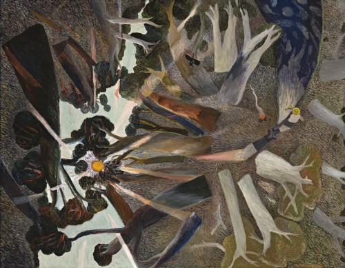 With its multiple viewpoints and sweeping panorama of darkness and light, earth and air, Bush Landscape with Sunbeams encapsulates well the highly original landscapes for which William Robinson has become so widely acclaimed and admired. Departing from predecessors such as Streeton, Drysdale and Williams who celebrated the harbours, deserts and rural plains of the continent, Robinson is unique in his devotion to an environment hitherto neglected by artists - the ancient, labyrinthine rainforests of his immediate surroundings in the coastal hinterland of Southern Queensland and northern New South Wales. Similarly, where the Australian landscape tradition had been characterised by a strong horizontality, Robinson here deliberately eschews established figure-ground relationships and conventional one-point perspective to transform landscape into a multiview experience - allowing every fold and fissure to be explored, yet still preserving a sense of panoramic continuity.