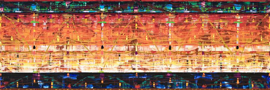 The concept of nature as three zones which are concurrently akin to the horizons of a landscape, or its elements (sky, earth, water) and the self-consciousness of the paint on the canvas... Like Matisse's use of oriental motifs in the Nice paintings where the pattern weaves everything into a tapestry of light, Johnson's mosaic of colours meanders in and through the image, seducing the viewer in a myriad of sensual forms which epitomise joie de vivre...