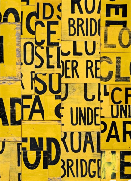 Of all Rosalie Gascoigne's achievements, undoubtedly the most striking and widely celebrated are her black-on-gold assemblages which, initially incorporating printed planks cut from wooden Schweppes soft drink crates progress to more minimalist compositions featuring retro-reflective road signs such as News Break. Discussing the present work, interestingly the artist observes, 'Some of it isn't reflective. You can tell by the writing. The stuff which is non-reflective is hand-done lettering. And the rest is machine-done lettering, it's good...'1 Having eschewed the use of iconography, Gascoigne thus transforms text into texture - a wordplay of which she is no doubt aware - to evoke a powerful sense of landscape and light. With their rhythmic pattern composed of letters, such works have not surprisingly been described as 'concrete stammering poems'2 - a perceptive analogy, especially given the artist's predilection for poetry from Shakespeare to Plath. Notwithstanding, Gascoigne stresses that the flickering word fragments, though carefully arranged, are not intended to be read literally: 'Placement of letters is important, but it's not a matter of reading the text - it's a matter of getting a visually pleasing result.'3 Similarly, her titles are not literal but rather, 'leave room for the viewer', imbued with multiple levels of meaning to be deciphered.