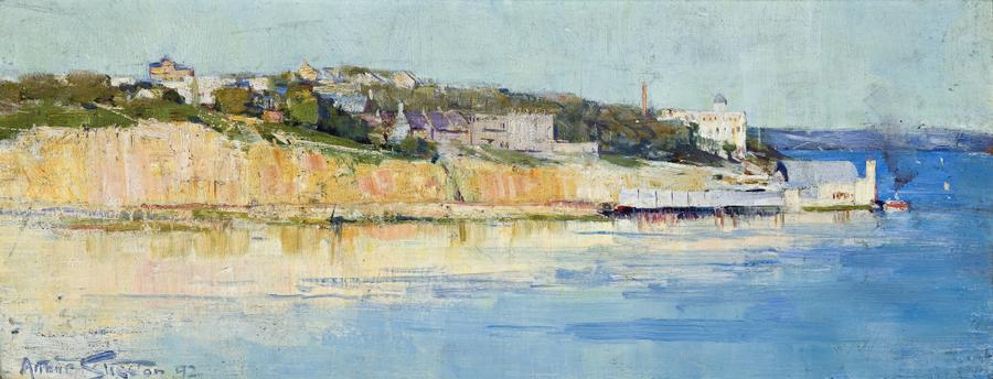 McMahon's Point, Sydney Harbour, was a favoured painting spot of Arthur Streeton's during the early 1890s. It inspired not only this painting but a number of other memorable images such as the companion paintings, From McMahon's Point - Fare One Penny, 1890, in the collection of the National Gallery of Australia, Canberra, and McMahon's Point Ferry, 1890, in the Hinton Collection, New England Regional Museum, Armidale. The focus of Streeton's attention in these two works of 1890 is the foreground, with Milson's Point providing an appealing backdrop. In North Shore, Sydney, 1892, and a smaller, related panel of about the same time, Milson's Point from McMahon's Point, Streeton changed his focus to the distant shoreline.1 The interest in both paintings is now Milson's Point, populated with the new buildings of the North Shore Ferry Company.