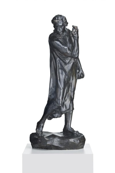 Drawing inspiration from the fourteenth-century Chronicles of Jean Froissart,1 Rodin radically departed from preceding interpretations of the episode (which typically featured the triumphant apotheosis of one hero) to capture instead all the protagonists' anguish and vulnerability as they embark upon their slow procession towards death. Barefoot and modestly dressed in sackcloth, indeed the figures are a poignant expression of human suffering - their enlarged hands and feet suggesting resignation and despondency, while their tautened muscles, deep-sunken eyes and furrowed brows evoke a palpable, heart-rending sense of physical torment. Importantly, each is treated equally - with the subtle disaccords between the various limbs and expressions of the individual figures paralleling the different stages of their unresolved inner struggles. As Rodin himself later mused, '...I have, as it were, threaded them one behind the other, because in the indecision of that last inner combat which ensues between their cause and their fear of dying, each of them is isolated in front of his conscience. They are still questioning themselves to know if they have the strength to accomplish the supreme sacrifice... their soul pushes them onward, but their feet refuse to walk.'2