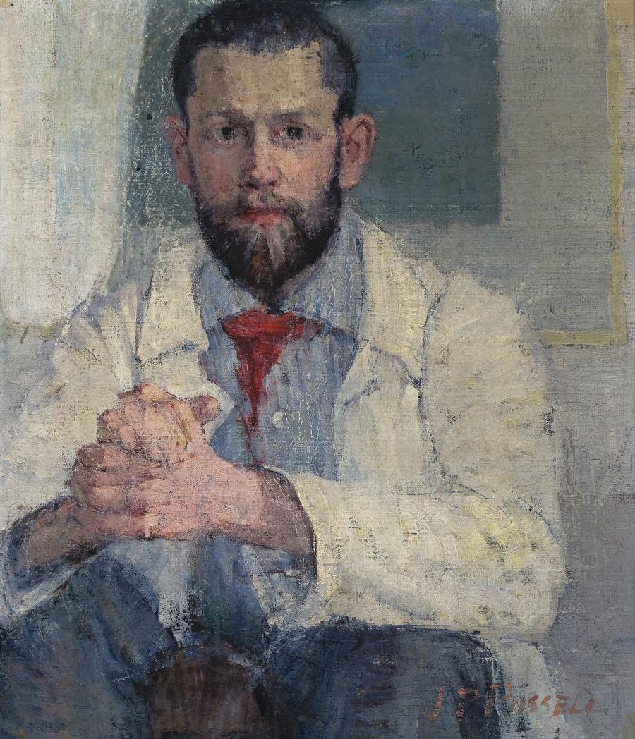 At the same time, working with Monet on the remote, storm-tossed island of Belle-Ile-sur-le-mer off the coast of Brittany, interestingly Russell was embracing very similar techniques; as he elucidates in a letter to Heidelberg school artist Tom Roberts back in Melbourne: 'No vehicle colour only on absorbed canvas or better on stiff canvas prepared only with glue. Simple colour but strong, kept pure as long as possible.'16 Although the canvas is by no means raw and the colour not always pure, the present portrait is, notwithstanding, an impressive demonstration of the French impressionist technique, with the fractural brushwork ranging from the boldness of the background and sitter's attire to the fine cobwebbed strokes of his face and neck. Closely related to Russell's highly acclaimed Portrait of Dr William Moloney c.1887 (National Gallery of Victoria, Melbourne), the portrait moreover betrays that powerful quality of immediacy and informality so essential to the vision of the European avant-garde.
