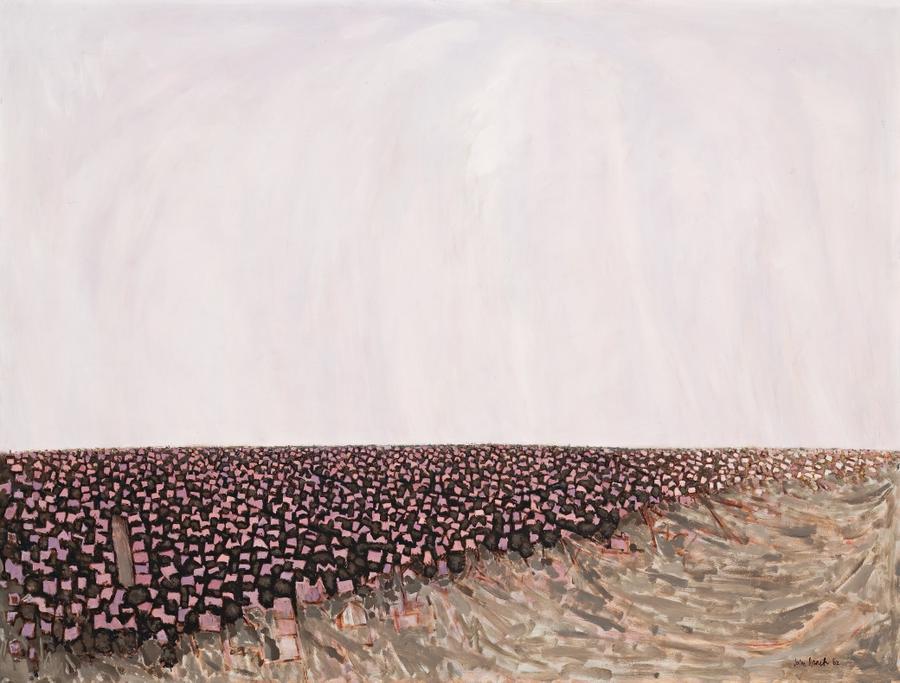 John Brack produced only seven paintings during 1962. The Roofs of Burwood was his most minimalist; Union Road provided a roof top view of his own suburb of Surrey Hills; and John Perceval and his Angels was later purchased by the National Gallery of Victoria. His appointment as Head of the National Gallery School, which he transformed into one of Australia's leading art schools, was the reason for this smaller output. Nevertheless, that same year of 1962 Brack was represented in the London exhibition, Commonwealth Art Today and Four Arts in Australia, touring South-east Asia. In subject, The Roofs of Burwood followed those earlier suburban interests as in the watercolour Segment of a Suburb (National Gallery of Australia, Canberra) and other paintings of the previous year, especially View of an Outer Suburb.1 Like our painting, it is taken from a high viewpoint, being close in concept and of the same location as this painting on offer. Brack's arms length view of suburbia is in itself a metaphor of his objectivity, the subject often being the starting point for an exploration of an aspect of aesthetics and style in what Grishin described as 'a greater questioning of the whole process of painting and its visual interpretation.' In particular, Grishin noted Brack's preoccupation with 'different levels of visual ambiguity in a painting and if it was possible to separate and reassemble them then the work could operate on a number of different levels of meaning and perception.'2 His explorations were noted as early as 1960, Brisbane critic Gertrude Langer remarking that 'in a number of paintings Brack has moved now towards almost total abstraction.'3 In The Roofs of Burwood Brack carried his vision of suburban satire over into the field of minimalism. His friend Fred Williams was also working in a minimalist style at this time as seen in his Sapling Forest series of 1961 and the You Yangs paintings of 1963. Both explored the aesthetics of the seemingly monotonous, so characteristic an aspect of the Australian landscape and suburbanscape. Brack painted very few landscapes, intentionally choosing the suburbanscape in direct opposition to the hackneyed transcript of rural beauty. To him the suburbs were soulless things. In The Roofs of Burwood Brack's subject is the urban sprawl continuing its relentless advance into the semi-rural. Nature resists, like a great wave of the sea, washing against the brick and tiled encroachment. The point is pressed home in the painterly movement of the landscape, the other, in an ironic reversal, static. The open sky and vastness of the heavens above continues Brack's vision of emptiness, a devastating metaphor of Melbourne suburban life. The evocation of the sublime and man the infinitesimal provides a pointed touch of irony.