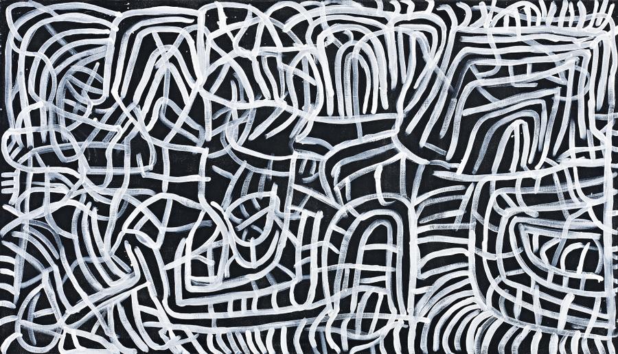 Alalgura (Yam) IV is a raw and unadorned ‘putting down’ of Emily’s story. To Emily this linear style was both signature and painting. It was arguable her strongest expression of ownership and custodianship of country, and the knowledge earned through ritual process and graduation to the most senior ritual woman of her country, Alalgura (Alhalkere).