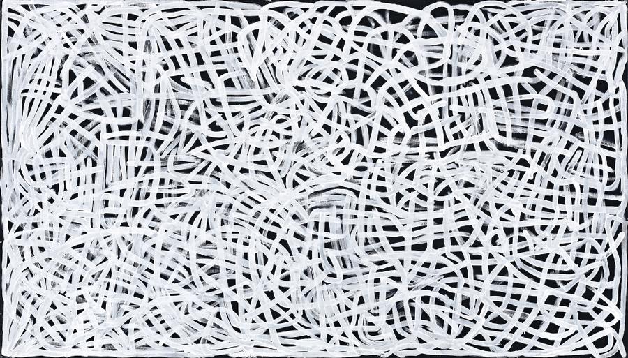 Line emerges fluidly, almost as an extension of Emily's physical self - a seemingly effortless transcription. Her hand, her baton, steers towards a cadenced resolve within the boundaries of the canvas.