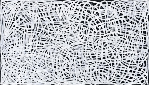 The mood is frantic with abundance; the growth is dense, mirroring Emily's country after rain. Nature's rhythm is accelerated. With a relentless forging brush, the random structure of the Yam plant is captured, spreading quickly and 'all over' (Emily). Emily is tuned to the energy of her country and the yam 'strings' which link the maturing yams beneath the soil. This energy connects through her and her laying it upon the canvas - so vigorous, so vital, and so fundamental to Emily was the imperative to seek food in an arid land, and to celebrate its plenty after rain.