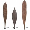 carved from hardwood with light patina, of elongated leaf like form, tapering to a spinifex resin handle at the base