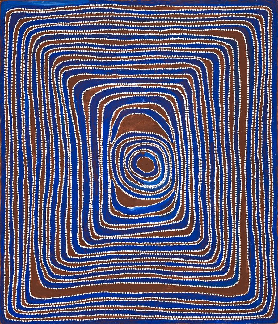 This painting is accompanied by a certificate of authenticity from Mangkaja Arts which states: 'This is a big waterhole for ceremony. After people have been travelling they stop here for ceremony. This is a most important jila (waterhole).'
