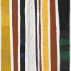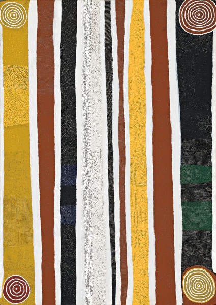 The confidence with which Sunfly Tjampitjin depicted this site is astonishing and attests to his great cultural knowledge. Rows of broad vertical bands of strong colour are separated by parallel lines of white and the work is framed at each corner by roundels. In this painting, changes of colour portray variations in scrub and vegetation. The pathways of the Kingfisher are dramatised by the use of lines of white dots, which appear to vibrate and oscillate on the surface of the canvas.