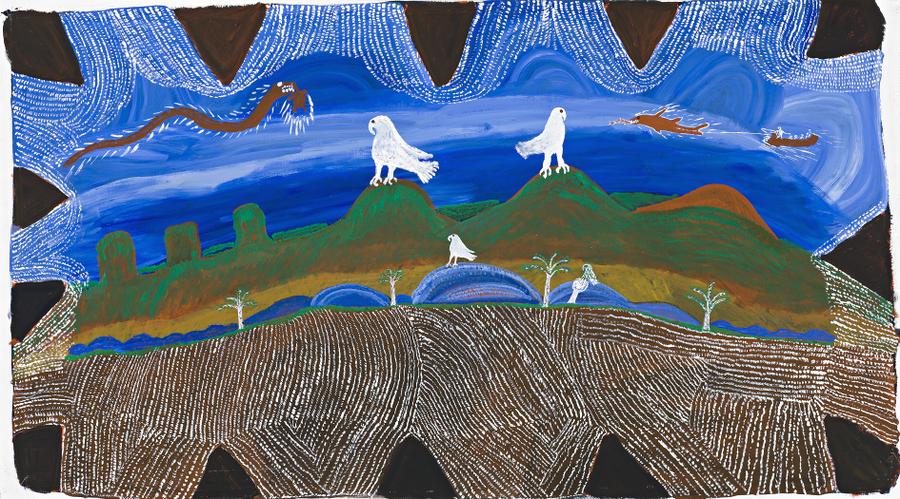 The most distinctive image in Munduwalawala’s work is the totemic white breasted sea eagle, Ngak Ngak, often shown singly or as a repeated image. Ngak Ngak fulfils the role of a guardian - looking after the country; Munduwalawala explained that there is an island near the mouth of the Limmen Bight River, which was formed when Ngak Ngak flew over it. This is Yumunkuni, or Beatrice Island. This is his mother’s country. The presence of Ngak Ngak is always explained: ‘this Ngak Ngak looking at this man’ or ‘this message stick’. Ngak Ngak is frequently shown looking at his own image; Ngak Ngak is generally shown as white.