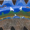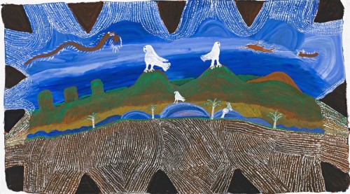 Munduwalawala’s images generally interpret in paint a sequence of events, which are focused on his mother’s country around the Limmen Bight and the Limmen Bight River in the Northern Territory of Australia. This country is the area around the Four Archers, a geographical formation about 45km inland on the Limmen Bight River. This country includes the Limmen Bight River and the Maria and Beatrice Islands at the mouth of the river. The artist’s mother is the cloud and the sun, and his paintings often depict heavy rain-filled clouds or fine rain and bright sunlight, his creation story.