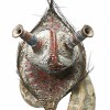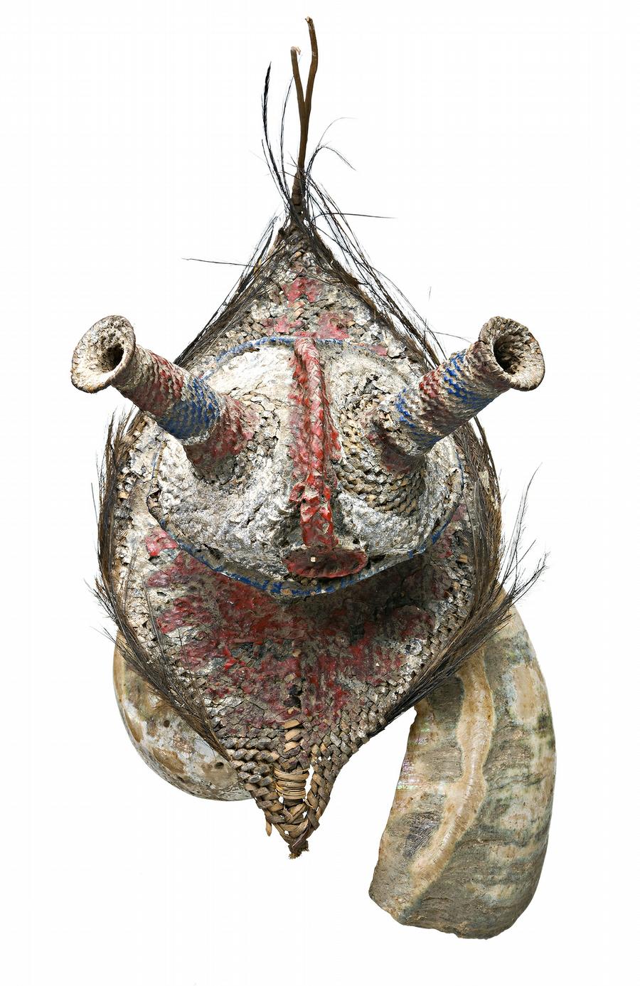the finely woven mask with two elongated eyes, red open mouth and finely painted polychrome decoration and feathers