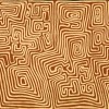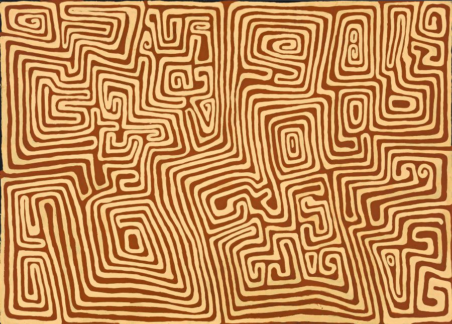 Marked by an arresting visual language, the work of Jackie Kurltjunyintja Giles is characterised by sinuous line work typically rendered in only two colours. As curator Georges Petitjean notes, ‘Giles’s work has a distinct monumental character. A heroic, male vision of the land and the stories connected to it resonate in strong graphic lines.’3 Forming a maze-like design, the warm hues of red and gold are a map of the Tingari cycle. The certificate from Kayili Artists states: ‘The tingarri people travel through the artist’s birth place of Tjamu Tjamu (west of Kiwikurra Community) to the walatu (claypan) site of Maruwa travelling north toward Wilikinkarra (Lake Mackay).’