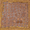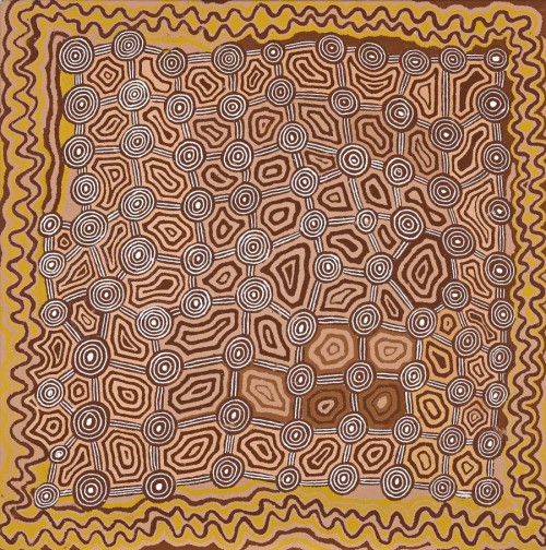 This work is accompanied by a certificate of authenticity from Papunya Tula Artists which states: 'This painting depicts the Two Snake Dreaming which travelled through the site of Kantinga, west of the Kiwirrkura Community. The sinuous lines at the edges of the work show the path of travel of this dreaming. As this mythology is associated with the secret Tingari Cycle, no further detail was given. Generally, the Tingari are a group of mythical characters of the Dreaming, who travelled over vast stretches of the country, performing rituals and creating and shaping particular sites. The Tingari men were usually followed by Tingari women and accompanied by novices and their travels and adventures are enshrined in a number of song cycles. These mythologies form part of the teachings of the post-initiate youths today as wellas providing explanations for contemporary customs.'