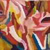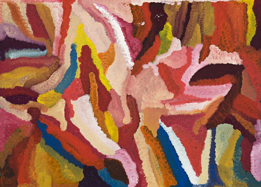 This vibrant painting belongs to a group of works produced between the beginning of 1992 and the end of 1993 that have been described as her ‘high-colourist period’. This phase of production was characterised by a succession of intensely bright paintings painted with a multi-colour palette. In this work, painted for Rodney Gooch’s Mulga Bore artists in early 1992, irregular shapes pulsate with intuitive combinations of hot pinks, citric oranges, deep blues and maroons colliding together and contained by the rectangular shape of the canvas. These blocks of colour are formed by building up layers of dots resulting in solid forms, a deviation from her earlier more pointillist application of dots where each defined layer of dates was expressed in the canvas. This period is also a time when her mark making became looser and more expressive. Kngwarreye’s expression in paint was less inhibited, lines and dots were blurred into expansive gestures as blocks of colour replaced dots and sinuous lines.