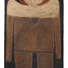 Executed on slate, this rare and beautiful work attributed to Alec Mingelmanganu is a striking example of a Wanjina being. Representing the spirit ancestors of the north-west Kimberley peoples, Wanjina created the laws of social behaviour and are associated with the life-giving properties of water, bringing the monsoonal rains and distributing the spirits of the unborn to their clan waterholes. With their forms pre-determined by mythological precedent, Wanjina such as that shown here are executed in both red and white pigments to represent that ‘their bodies are partly filled with blood, partly with water.’1 Said to have emerged from the clouds, the beings’ bodies are typically rendered devoid of anatomical detail, the length of the torso delineated by the band around the waist which indicates a hair belt and the black oval shape upon the chest which is said to denote a breast bone.