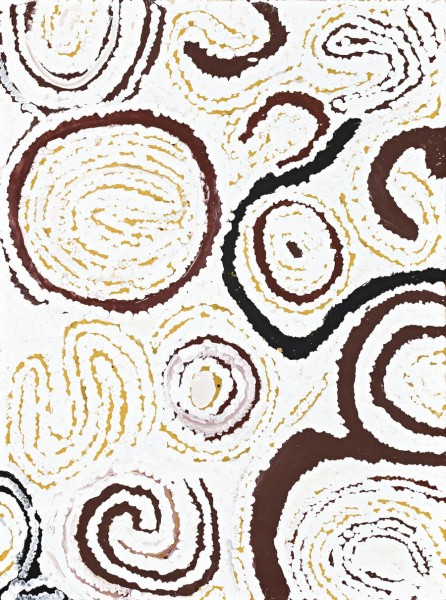 This painting is accompanied by a certificate of authenticity from Red Rock Art which states: 'Warla is a place in the Great Sandy Desert south west of Balgo Hills in Northern Western Australia. The artist describes the country as 'flat like an airport.' It contains hundreds of rock holes, many of which are sacred burial places and many are sacred waterholes crucial to survival. If travelling through this area, Billy says 'you really should go right around'. When the big rains come, the flat expanse becomes a lake and as the water recedes, the rock holes are renewed with fresh water.'