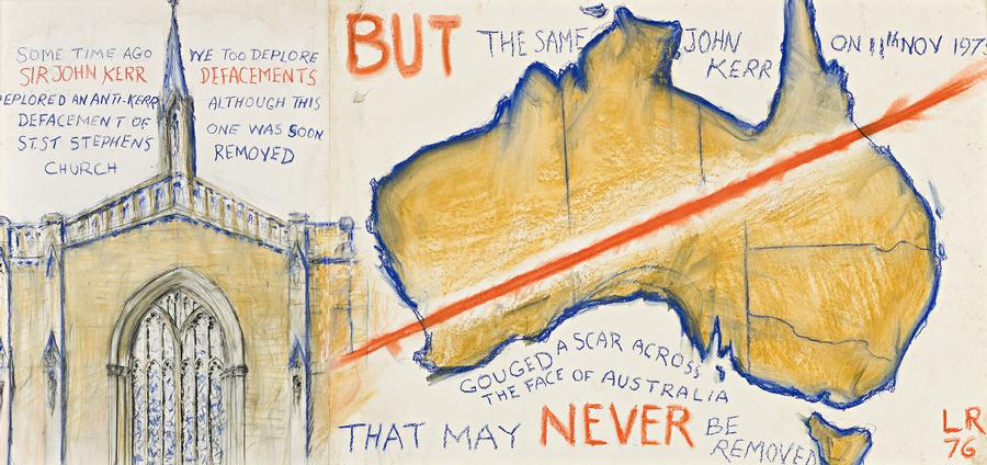 "My second essay into political car tooning was a vicious affair - an anti-Kerr, large watercolour drawing for a pro-Whitlam exhibition at the Hogarth Gallery, Paddington, during the election campaign following Mr Whitlam's dismissal. The theme of it was a large coloured map of Australia with a black line subdividing from West to East. On the left of it was the portal and part of the frontage of St Stephen's Church in Macquarie Street, on which a nasty anti-Kerr slogan had been printed. In an address in this church the Governor-General referred to the miscreant who had printed this graffiti on such a building. On my poster, underneath the illustration, I expressed agreement with Kerr's anti-defacement words but continued with the statement that the words on the church wall could easily be erased, whereas Kerr had gouged a line across Australia that would take generations to remove - or words to that effect. It is interesting to note that the drawing was purchased and taken to Canada."