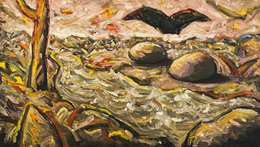 Powerfully evoking the aftermath of some terrible disaster, vividly captured with menacing abstract forms and agitated, heavily applied brushwork, The River 1985 is a dramatic image of intense anxiety encapsulating well Booth's landscapes from this period. While undoubtedly infused with memories of his childhood in the blackened industrial landscape of Sheffield, perhaps more fundamentally, the series resonates with the artist's experience of the prehistoric local terrain - and particularly, of working in the bushfire-ravaged areas of Victoria during 1983. (Indeed, the closely-related Desert 1985 in the collection of the Museum of Modern Art, New York, has been described by Booth as his nearest approximation to a specifically 'Australian' landscape in terms of light and desolation.1) A metaphor for the artist's subjective relationship to the natural world, such scenes not only blur the boundaries between the realm of the subconscious and that of observed reality, but notably merge figuration and abstraction, with elements of the natural environment acting as potent signs which erupt from the canvas with stunning emotional force. Accordingly while the winding river here links earth and sky compositionally, it also resists gravity with an ambiguous, pulsating life suggesting the possibility of delivery from chaos - thus poignantly highlighting Booth's abiding assertion that even the bleakest of his landscapes 'is not without hope!'2