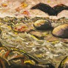 Charged with emotion and symbolic meaning, The River 1985 belongs to a transitional phase in Booth's oeuvre between his celebrated 'apocalyptic' paintings executed from 1977 to 1982, and the quiet chill of the snow paintings which he commenced during the winter of 1989. In the iconic Painting 1977 (Man on the road with white dog) from the National Gallery of Victoria, the displaced everyman-prophet is forced to begin a journey in a post holocaust (nuclear) world as a consequence of man's self-destructive violence and greed. The subsequent group of paintings charts his descent into Hell and the emergence of a race of mutants, while the noticeably desolate snow paintings of the 1980s and frozen landscapes of the 1990s herald the end of man's cycle of ambition - the white blanket of snow or sleet muffling the screams of the decay of civilisation (see lot 3). Thus, Booth presents a Blakean devolution from civilisation towards tribalism and eventually extinction - a journey that has its antecedents in Milton's epic sequence of poems, Paradise Lost (1667) to Paradise Regained (1671).
