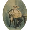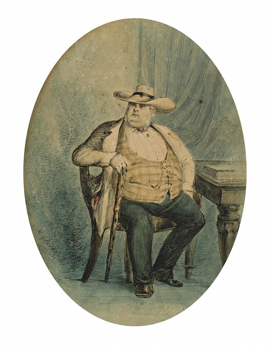 Arriving in Adelaide from England late 1838, William Baker Ashton was appointed first Governor of the Adelaide Gaol, a position he held until his death in 1854. Every known image of Ashton depicts his large frame engulfed by a trademark patterned waistcoat with wide-brimmed hat and walking stick. The State Library of South Australia holds all other known images of Aston by Henry Glover including the large watercolour The Governor and his Staff at the Adelaide Gaol.