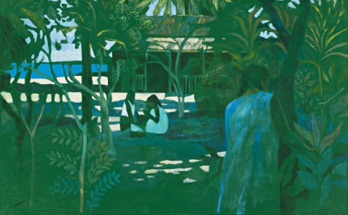 Ray Crooke's Woman in a Garden, Moorea depicts three French Polynesian women escaping the heat of the day under a lush canopy of tropical foliage. Painted with his characteristic simplicity, the figures are treated in the same manner as the flattened landscape, indicating a balance between the natural world and its inhabitants. The palette of blues and greens, highlighted by visible brushstrokes and complimentary touches of yellow, gives the painting its distinctive haze and produces a sense of the 'heat induced lassitude'1 brought on by an enervating climate.