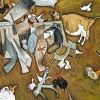 William Robinson's farm constructions tug at our childhood memories of the family 'farm visit' so common to growing up in Australia. With its central character being the urinating cow, this painting channels the sheer joy and amusement this everyday bovine act evinces in the child. The commotion of the chooks attempting to take flight and the geese gaggling, amidst Rosie's great release, contrasts with her steadfast inhibition as she stares dolefully at the audience, caught in the act. Other delightful Robinson cameos are also present such as the prized spotted bantam outside of its makeshift hutch and the benign white goat, head peaking out to observe all the fuss.