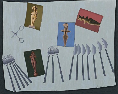 Belonging to the 'Unstill Life Series' (as Brack ironically dubbed the inaugural exhibition at Joseph Brown Galleries in 1975), The Fertility Goddesses 1974 is a superb example of such compositions in which the knife, fork and scissor motifs of his earlier shop window paintings now precariously intermingle with glamorised postcards featuring fragments of prehistoric art. With the attitudes expressed towards the postcards by this society of utensils ranging from admiration to disregard and angry assault, accordingly the series may be interpreted as a comment upon the perception of ancient cultures by the modern world. There is also truth to Grishin's argument that Brack's postcard imagery emerged from the artist's fascination with the souvenirs' 'user-friendly' aspect which made them less intimidating (and paradoxically, more appealing) to viewers than the artworks themselves - an accessibility accentuated by the postcards' ability to present 'improved' versions of the original.2 In this vein, the series resonates with the artist's appreciation of both the writings of French art theorist Andre Malraux (especially his concept of the portable, personal musee imaginaire) and the art of surrealist Rene Magritte who often included paintings of paintings within his canvases to highlight prevailing notions of the artificial being more real than the real thing.3 As Grishin aptly encapsulates, the series 'raises questions of the authenticity, falsification and durability of art as well as permanence, stability and impersonality in a glittering but collapsing society.'4