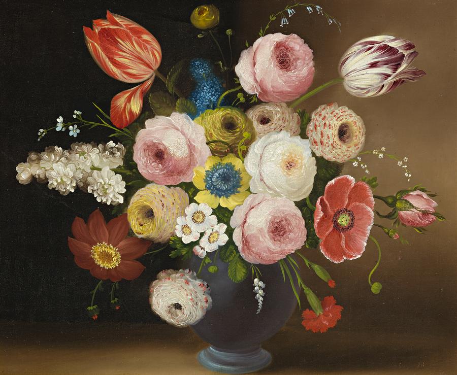 The artists of colonial Australia were fascinated by the extraordinary flora and fauna of the Antipodes, giving their art its special appeal, redolent with history and the individualities of the age. William Buelow Gould made numerous studies of the botanical and marine life of Tasmania, his pioneering studies being highly valued today for their scientific accuracy. His still life paintings in oil are quite a different matter, being mainly of English subjects, their quiet dignity in sharp contrast with his pitiful life. The image of Flowers in a Blue Jug c1850, with its calm beauty, entrancing colours, and innocence could not be further from Gould's alcoholic affliction, gambling, and theft. Born in Liverpool, the son of the Mersey river pilot James Holland, Gould studied under the Royal Academician William Mulready. His interest in the seventeenth-century Dutch masters was an early influence on Gould. This was extended through Gould's later work at the Spode, Staffordshire potteries, where it is thought he provided floral and scenic decorations for their famous porcelain wares. As Gould's life spiraled downwards, he deserted his wife and child, and adopted the name 'Gould'. In 1827 he was sentenced to transportation for seven years for stealing clothes.