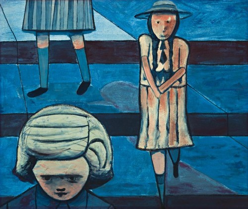 One of Blackman's earliest interpretations of the theme, The Stairs 1952 presents a myriad of emotional states, from vulnerable and self-absorbed to all-knowing, even predatory. More specifically perhaps, the very awkwardness of the act of walking down steps becomes a metaphor of youth - the girl to the right ungainly with her hunched shoulders, yet trying hard to be otherwise, while to the left, the young head is by contrast more mature and purposeful, questioning that which lies ahead. As such, the figures, divided by bands of deep blue, may be understood as symbolising stages of youthful progress - of coming and going, and the emotions that each entails.