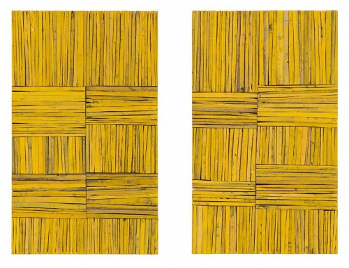 An austere and extremely sophisticated work constructed from the artist's 'signature' material, the shimmering yellow-gold Schweppes crates, Stooks I and Stooks II 1991-92 bears close affinities to her celebrated four-panel masterpiece, Monaro 1989 in the collection of the Art Gallery of Western Australia and particularly, the late work, Plenty 1996 in the National Gallery of Australia, both of which lyrically echo the billowing of sun, shadow and wind upon undulating fields of wheat. Although its title alludes to the sheaves of grain stalks typically placed upright in fields to dry, similarly the present work is by no means a literal representation; rather, it derives its strength and honesty from the artist's deft arrangement of such prosaic material, discarded long after its commercial use had expired, to embody in a partial but concrete fashion a sense of the Australian landscape.