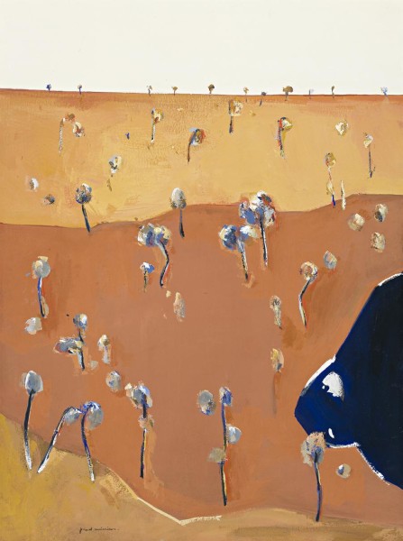 The gouache Waterpond in Landscape 1966 is among Fred Williams's finest watercolours. The first thing to catch the eye is its striking colour drama combined with an engaging feeling of immediacy. Add to that the interplay between flatness and ever-subtle illusion, together with the sensuous milky textures of the rich pigments, and you have a feast of visual delight. Figuratively based on the water pond at Lysterfield, it is majestically redolent of the sun-baked Australian landscape and its related atmosphere. Bold areas of colour, gradations, and detailed features nevertheless conjure up all the complexities and fascination of a non-figurative work. In this brilliant fusion of reality and abstraction, Williams characteristically presents views in profile and plan, as gum trees sport across fields of ochre. Surfaces are further enlivened by the textured colours and contrasting blues of the gums, all intruded upon by the dark depths of the pond. The movement both into and across the picture surface is held in perfect balance. Although the rising plane of the landscape leads the eye high into the distant horizon, the ascending bands of colour emphasize its flatness, which in turn is married to that of the picture plane. Irregular contours and dancing eucalyptus trees add further lively interest.